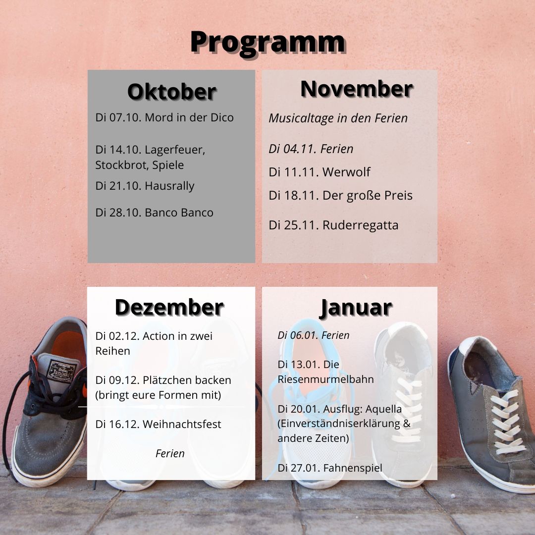 Unser Programm ist bunt gemischt, von Spielen und Aktionen, wie Hausralley, Action-Spielen oder gemeinsamen Ausflügen, bis hin zu spannenden Geschichten aus der Bibel, die unser Leben betreffen.
