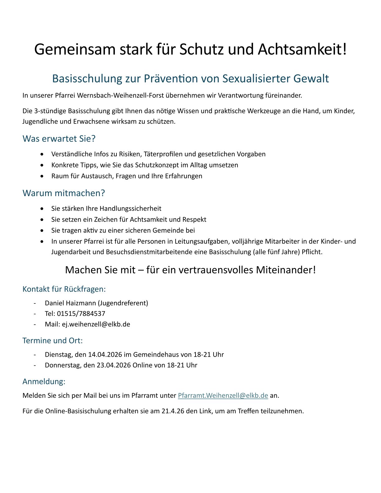 Die Kirchengemeinden Weihenzell, Wernsbach und Forst haben ein Schutzkonzept für ihre Veranstaltungen und Räume zur Vorbeugung von sexualisierter Gewalt zu erarbeiten.